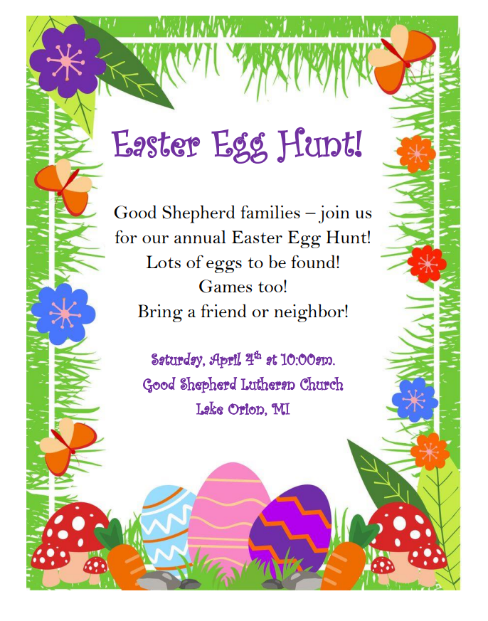 All are welcome to join us for an annual Easter Egg Hunt!  A great family time with games, an egg hunt, and fellowship!  See you there!